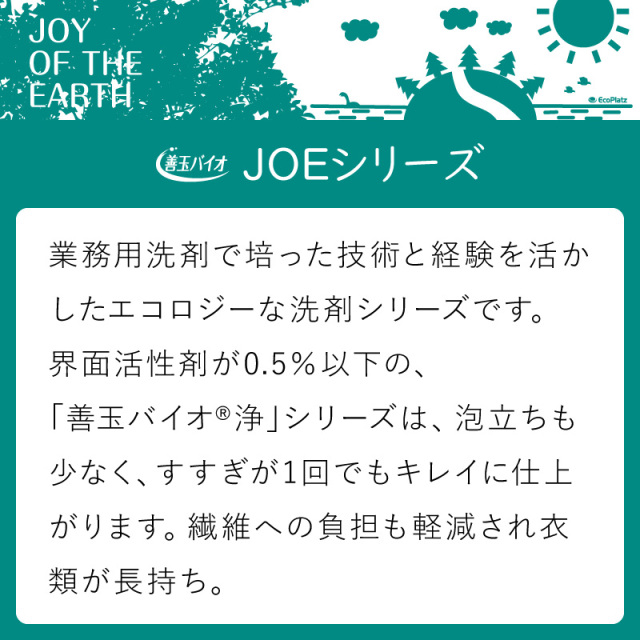 品 名 洗濯用洗剤 用 途 綿/麻/合成繊維 液 性 弱アルカリ性 成 分 アルカリ剤(炭酸塩)/水軟化剤/分散剤 再汚染防止剤(カルボキシメチルセルロ-ス) 酵素/善玉バイオ(特殊酵素) 植物性脂肪酸 正味量 1.3kg×3箱、スプーン付 販売元 株式会社エコプラッツ ※お洗濯には用途の範囲内でご使用ください。 ※「善玉バイオ」は、株式会社ツー・エム化成の登録商標です。 ※「JOE」は、株式会社エコプラッツの登録商標です。