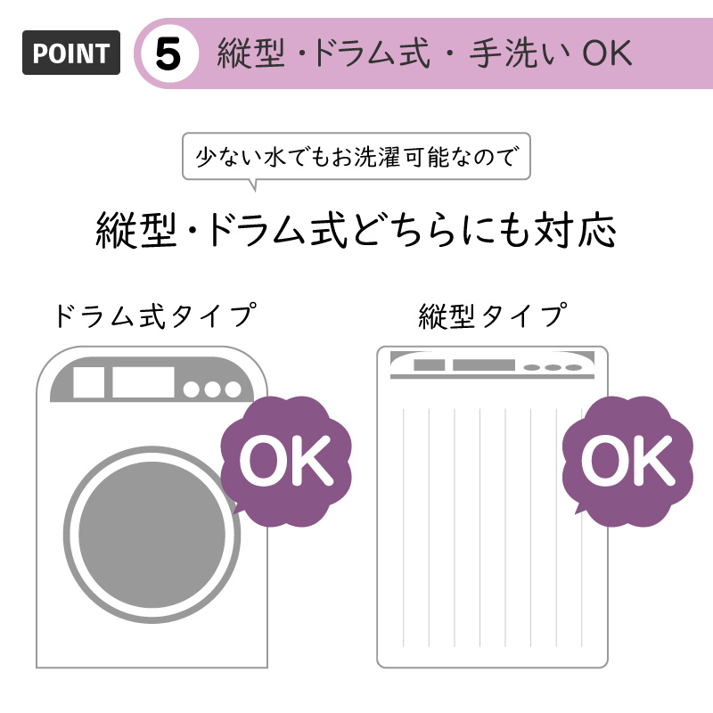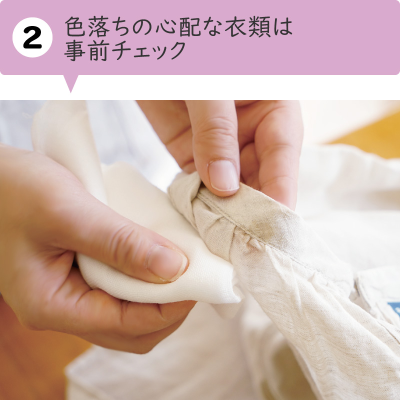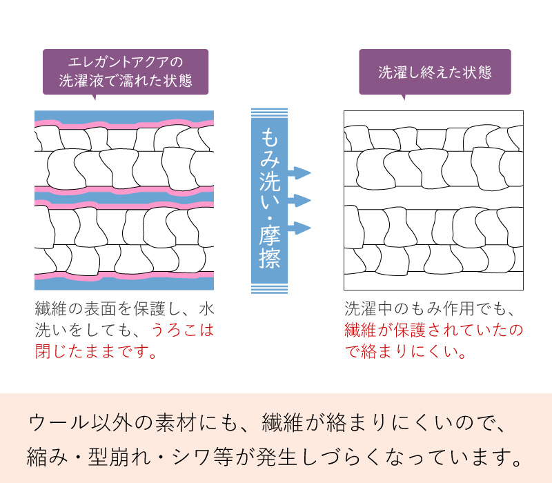 衣類が水より先に衣類に浸透することで縮み、色にじみ、シワの発生を抑えます。